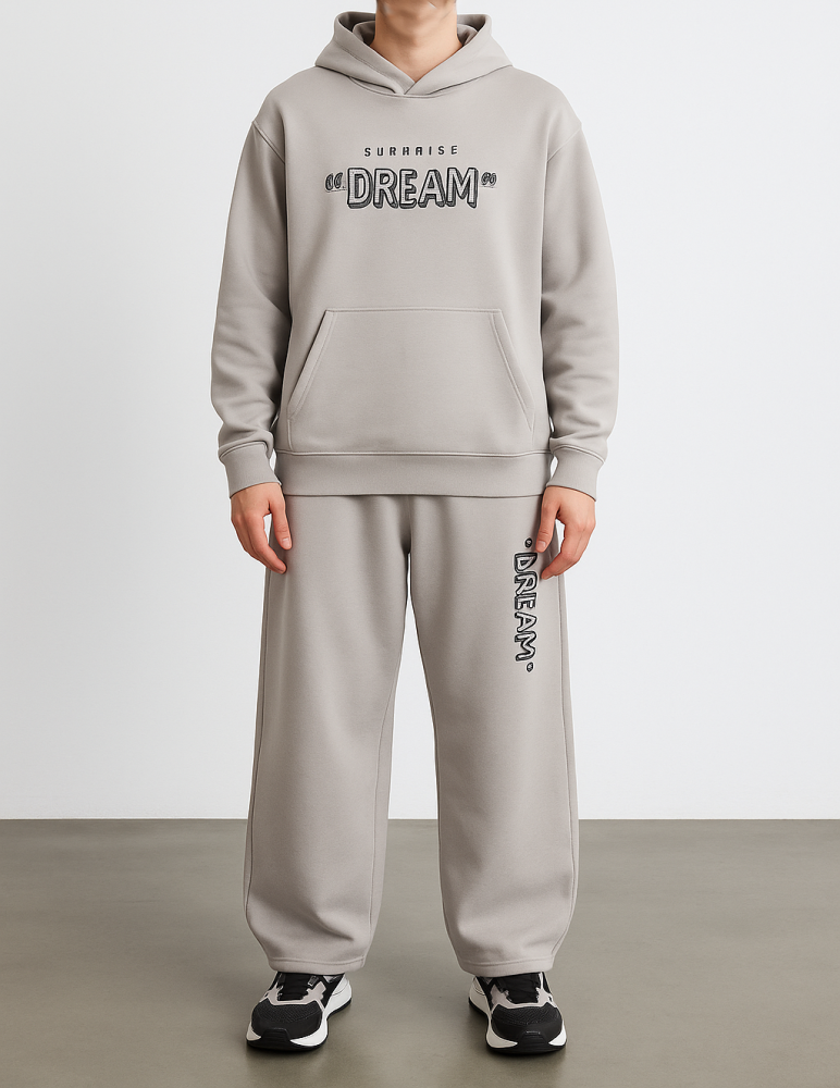 طقم رياضي رجالي أنيق بتصميم عصري مميز يحمل عبارة "SURPRISE DREAM" على الصدر والساق، يمنحك إطلالة مريحة وعملية تناسب مختلف الإطلالات اليومية.